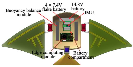 The rigid shell of the robotic manta ray provides ample space for accommodating various electronic devices, control components, and batteries. The internal layout, as shown in Figure 2, includes four sets of 7.4 V lithium batteries positioned at the central bottom of the shell to lower the center of gravity and ensure balance. Above the battery compartment, the controller, inertial measurement unit (IMU), and battery level monitoring module are placed at a relatively higher position to protect the electronic components from direct damage in case of accidental water ingress. The attitude sensor is centrally located within the internal space of the shell, accurately capturing the manta ray’s posture. The power module is connected to a separate battery compartment through support pillars at the bottom of the shell, providing both convenience of connection and waterproofing functionality. The machine vision computing module, equipped with a Jetson Xavier NX board, is located at the back of the robotic manta ray, powered by a dedicated 14.8 V battery. The two buoyancy balance units, positioned on both sides of the robotic manta ray, serve to adjust the center of gravity, thereby increasing stability and balancing buoyancy forces.