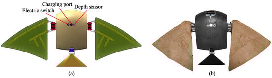 The bottom layout of the robotic manta ray is depicted in Figure 3. The waterproof electric switch, charging port, and depth sensor are positioned within the central groove of the robotic manta ray. This design can avoid affecting the overall hydrodynamic performance. The binocular camera, as shown in Figure 3b, is externally mounted on the bottom of the robotic manta ray, facilitating easy disassembly and expansion.