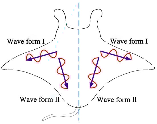 The pectoral fin is the most crucial locomotion organ of the manta ray [38] and serves as the core design element in the robotic manta ray. According to relevant biological research, the complex and flexible deformation of the pectoral fin during stable cruising can be decomposed into the superposition of two orthogonal traveling waves [39]. As shown in Figure 4, traveling wave I propagate from the base to the tip of the pectoral fin along the span direction, while traveling wave II approximately propagates from the head to the tail along a chord parallel to the water flow. By coordinating these two sets of traveling waves, the manta ray achieves efficient and agile motion.