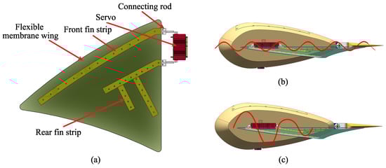Inspired by this, this paper proposes a bio-inspired manta ray pectoral fin design scheme, where the propulsion mechanism of the pectoral fin employs a simple configuration of two pairs of fin strips and a flexible membrane wing. The overall structure of the pectoral fin is illustrated in Figure 5a. Each pectoral fin is equipped with two digital servos capable of continuous bidirectional rotation from 0 to 180 degrees, enabling independent or synchronized control. This design scheme allows for switching between undulating and flapping propulsion modes. The servo motion of the pectoral fin follows a sinusoidal pattern as described by Equation (1), where represents the angular motion of the front servo, represents the angular motion of the rear servo, represents the phase difference between the front and rear servos, and represents the servo bias angle.