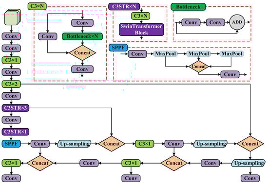 To further extract global features from images and improve the accuracy of sea cucumber detection, this paper proposes a network based on YOLOv5s-ST (combining YOLOv5s with Swin Transformer). By introducing swin transformer blocks into the structure, it effectively considers shift invariance, scale invariance, and receptive field in convolutional neural networks, while also capturing global information and learning long-range dependencies. It ensures information propagation between windows through windows and shifted windows, effectively reducing the computational overhead in dense prediction tasks based on transformers. This achieves global modeling with good generalization capabilities [32]. The main improvement is the incorporation of swin transformer block modules into the two C3 modules of the CSPDarknet53 backbone, referred to as C3STR modules, to extract more advanced semantic features. This enhances the ability to extract globally correlated features from images. The YOLOv5s-ST algorithm framework is illustrated in Figure 6, and the structure of the swin transformer block is shown in Figure 7.