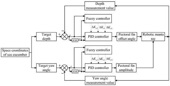 In the depth control system, the depth sensor and the set depth value are the inputs to the controller. The error e and the rate of change in error ec are calculated based on these inputs. The error and error rate are used in the fuzzy PID controller to compute the modified values of the traditional PID parameters, namely , , . Similarly, in directional control, the inputs to the fuzzy PID controller are the yaw angle error e and the rate of change in the yaw angle error ec. The fuzzy PID controller for the approach control consists of a depth controller and directional controller, which is illustrated in Figure 9. In the approach control system, the binocular camera sends the three-dimensional spatial coordinates of the sea cucumber to the lower-level controller. The lower-level controller utilizes the fuzzy PID controllers for depth and direction control to adjust the fin strip’s bias angle and amplitude for the next motion cycle.