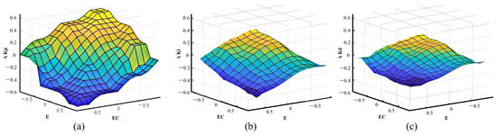 The fuzzy inference designed in this study is based on the fuzzification of the error e and the error rate ec, as well as the fuzzy rule base, to derive the fuzzy subsets corresponding to , , and . The three-dimensional surface plots of the fuzzy-inferred output variables are depicted in Figure 10. It can be observed that the output variables exhibit smooth changes as the input variables vary, which satisfies the basic requirements of fuzzy control rules. In the figure, different colors represent different values of , , and , with yellow representing larger values and blue representing smaller values.
