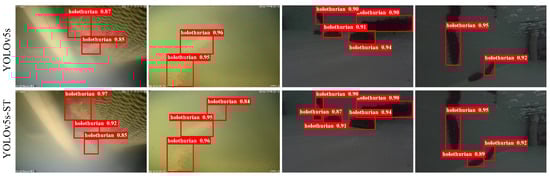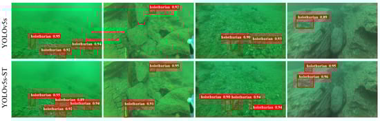 To better validate the effectiveness of the algorithm, this study conducted experiments on the URPC public dataset. In the same experimental environment, a comparative experiment and performance evaluation were performed using YOLOv5s-ST. Additionally, to address the challenges posed by harsh underwater environments, the relative global histogram stretching (RGHS) [45] image enhancement method was employed for preprocessing the images. The comparative results of model training on the public dataset are shown in Figure 11. From the figure, it could be observed that YOLOv5s-ST was capable of detecting smaller and more concealed sea cucumbers and successfully detecting a larger number of sea cucumbers. The comparison demonstrated that YOLOv5s-ST outperforms YOLOv5s in terms of detection performance.
