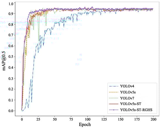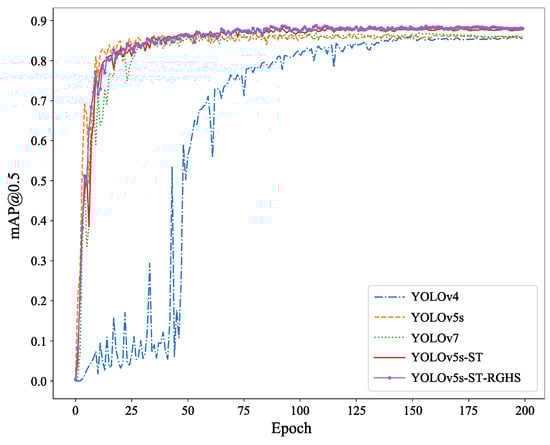 As shown in Figure 12, the comparison of average precision (AP) before and after the improvement was depicted. The mAP@0.5 represents the AP for each category when the intersection over union (IoU) threshold is set to 0.5. It could be observed that the purple curve exhibited greater improvement compared to the yellow, green, and blue curves. The blue curve rises the slowest, indicating the slowest fitting speed during YOLOv4 training. Although the yellow and green curves have a faster-rising speed, with the increase in training rounds, the stable mAP@0.5 value is slightly lower than that of the purple and red curves, indicating that YOLOv5s and YOLOv7 have a faster fitting speed during training. However, the accuracy after full training is less than that of YOLOv5s-ST and YOLOv5s-ST-RGHS.