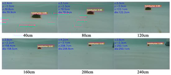 To test the localization accuracy of the binocular positioning method, distance measurements were taken every 40 cm. Manual methods were used to measure the positioning of the binocular camera relative to the sea cucumber. This experiment was conducted in a recirculating water tank in the fish farming facility. Since the sea cucumbers adhered to the bottom of the tank, the binocular camera was moved during the experiment. The movement may have caused slight variations in the horizontal and vertical directions. Figure 15 illustrates the target recognition and 3D positioning of a single sea cucumber using the binocular camera. By performing 3D positioning and distance measurements on individual targets, the localization accuracy of the aforementioned method was verified. The measurement results are shown in Table 5.