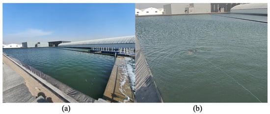 The experimental setup for the motion control of the biomimetic robotic manta ray in this study primarily consisted of the biomimetic robotic manta ray and a remote control terminal. The two components communicated and transmitted data through a wireless RF module. Multiple motion control experiments were conducted at the sedimentation pool of Mingbo Aquaculture Company in Laizhou, China. The experimental site is depicted in Figure 16.