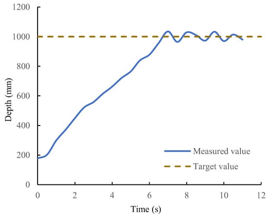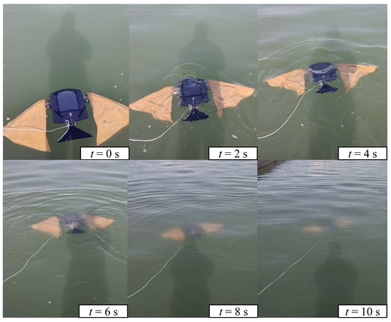 In the depth control experiment, the biomimetic robotic manta ray had an initial depth of 0.2 m, and the target depth was 1 m. Figure 17 illustrates the depth variation curve, where the brown dashed line represents the desired depth and the blue solid line represents the actual depth measured by the sensor. The biomimetic robotic manta ray reached the target depth within 7 s and maintained it in the vicinity of the target depth. Several snapshots of the closed-loop depth control experiment are shown in Figure 18. The biomimetic robotic manta ray rapidly reached the desired depth with no significant overshoot and remained stable near the desired depth. The steady-state error was within the range of (−30 mm, 30 mm). This indicated that the depth controller was capable of achieving precise depth control for the biomimetic robotic manta ray.