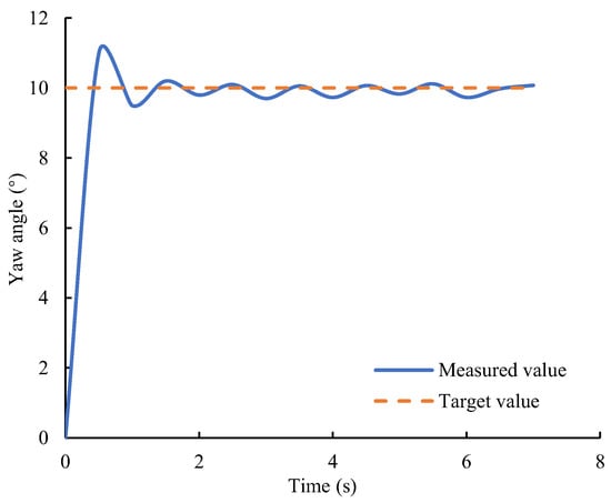 During the motion of the biomimetic robotic manta ray, there was a risk of collision with obstacles due to the absence of active obstacle avoidance capability. This can cause loosening or deformation of the pectoral fin linkage mechanism, resulting in inconsistent thrust generated by the left and right pectoral fins, thereby affecting the motion posture of the biomimetic robotic manta ray. Therefore, a direction control system was designed to adjust the motion posture of the biomimetic robotic manta ray by altering the flapping amplitude of the left and right pectoral fins. Figure 19 illustrates the yaw angle variation curve (blue solid line) under the influence of the direction control system during straight swimming, with the target yaw angle indicated by the orange dashed line. The biomimetic robotic manta ray reached the target angle within 2 s and maintained it in the vicinity of the target angle. The experimental results demonstrated that, under the effect of the direction control system, the biomimetic robotic manta ray could maintain the desired yaw angle with a steady-state error within the range of (−1°, 1°).