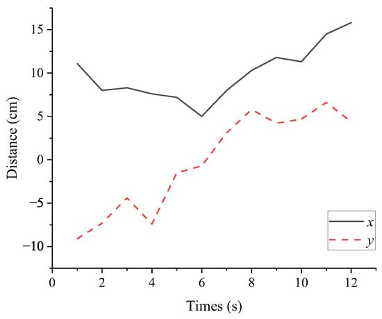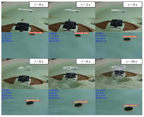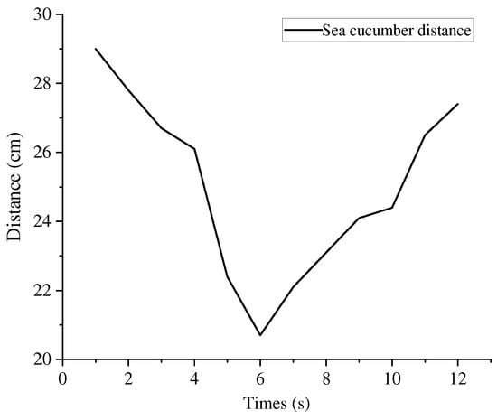 The rapid descent process of the biomimetic robotic manta ray resulted in large changes in the viewing angle, leading to target loss. Since the prototype lacks a gimbal system, it only performed two-dimensional approach motions. The screenshots of the approach motion and underwater sea cucumber localization video sequences are shown in Figure 20. From 0 to 6 s, the manta ray performed the approach motion and then started to move away after 6 s. Once the biomimetic robotic manta ray detected the three-dimensional spatial coordinates of the sea cucumber, it fine-tuned its motion direction by adjusting the deflection angles of the left and right pectoral fins. In the underwater images, the midpoint position of the left boundary was taken as the origin (0, 0) for the coordinate system. The x-values to the right of the origin were all greater than 0, while the y-values above the origin were negative, and below the origin were positive. The two-dimensional coordinate changes of the sea cucumber are illustrated in Figure 21. In the y-direction, the distance between the biomimetic robotic manta ray and the sea cucumber initially decreased and then increased. In the x-direction, at 2nd, the biomimetic robotic manta ray adjusted its motion direction toward the sea cucumber target, and at 5 seconds, it further adjusted its motion direction. At 6 seconds, it crossed over the sea cucumber from above and gradually moved away. The distance variation curve between the biomimetic robotic manta ray and the sea cucumber is depicted in Figure 22, showing that the distance initially decreased and then increased, indicating that the biomimetic robotic manta ray first approached and then moved away from the target under the effect of inertia. This confirmed that the biomimetic robotic manta ray could perform approach motions toward the sea cucumber target under the influence of the approach control system.