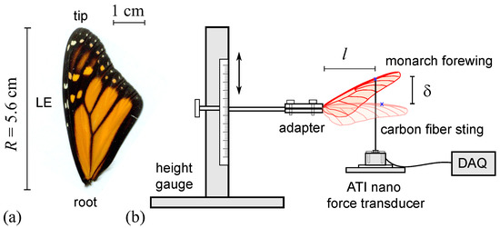 - Twigg, R.; Sridhar, M.; Pohly, J.A.; Hildebrandt, N.; Kang, C.K.; Landrum, D.B.; Roh, K.H.; Salzwedel, S. Aeroelastic Characterization of Real and Artificial Monarch Butterfly Wings. In Proceedings of the 2020 AIAA Scitech Forum, Orlando, FL, USA, 6–10 January 2020. AIAA 2020–2002. [Google Scholar] [CrossRef]
