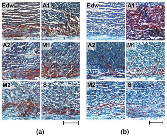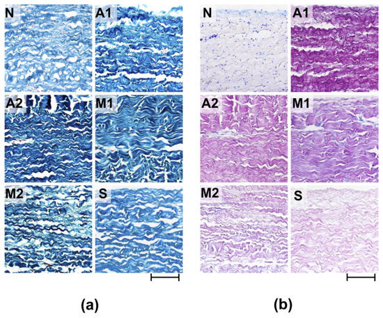 Fuchsinophilic saturation of collagen fibers was also characteristic of all the studied groups, which may be associated with both damage to the collagen matrix and GA concentration since the lowest degree of fuchsinophilia was observed for samples S and the highest for A1. In the samples of all studied groups after preimplantation treatment, acidic GAGs were not detected (Figure 1b).