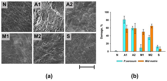 Results of morphological analysis of experimental samples before (N) and after processing. (a) SEM of p.serosum surface; scale—200 µm; (b) summary graph of the degree of damage to the surface of p.serosum and the medial matrix of ECM.
