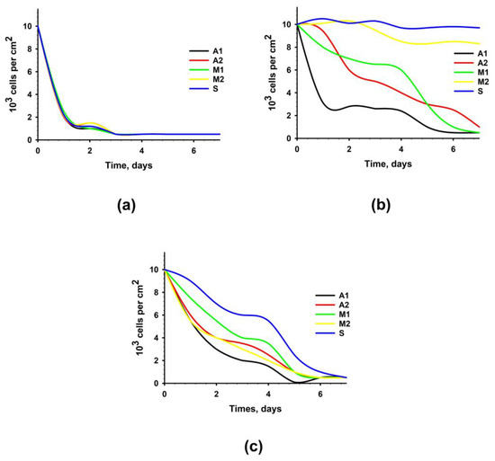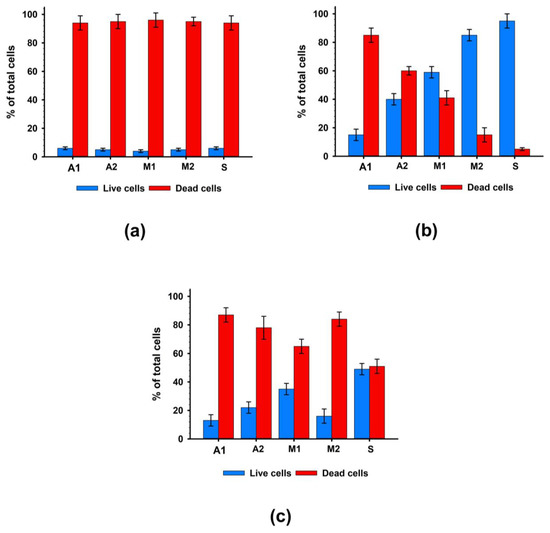 Additional washing (four days) significantly suppressed the cytotoxic effects of the biomaterials (Figure 3b). The materials of the M2 and S groups, in which cell survival was at least 80%, had the least cytotoxic effects on cells. In Groups A2 and M1, cell survival increased by four and six times, respectively. At the same time, in Group A1, cell survival after 96 h of cultivation remained low and did not exceed 15%. Thus, additional washing of samples simulating the leaching of chemical agents in the systemic bloodstream suppressed the contact cytotoxicity of biomaterial samples to the greatest extent for Groups M2 and S and to a lesser extent for Groups A2 and M1 but did not suppress the cytotoxicity in Group A1 samples.