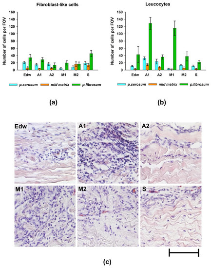 In Groups A2 and M2, the relative number of leucocytes was approximately 70%, whereas, in the Edw control group, the cell population was equally represented by leucocytes and fibroblast-like cells. In Group S, the number of migrated leucocytes did not exceed 32% (Figure 5). From the p.serosum, cells migrated in smaller numbers, mainly in groups where uniform cell migration into the matrix thickness was observed (all groups except M1).