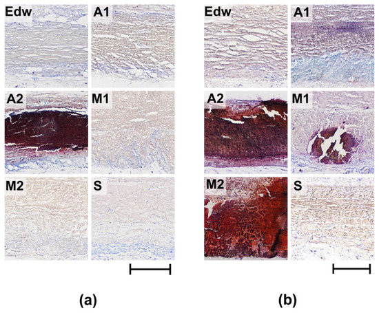 In Group A2 samples, pathological calcification was observed 8 weeks after implantation. Mineralized samples from this group were characterized by low rates of resorption of the collagenic matrix (Table 2, Figure 7a). Groups M1 and M2 underwent mineralization only at later implantation periods (24 weeks), accompanied by a significant decrease in the intensification of cell-resorptive processes (Figure 7b). At the same time, in the M1 group, calcification intensity was relatively low, which may be due to the low degree of repopulation of the medial matrix by recipient cells. In Group A1, in which there were no signs of aseptic calcification, the maximum degree of cellular resorption was observed with the migration of a large number of resorbing cells, even at late periods of 24 weeks.