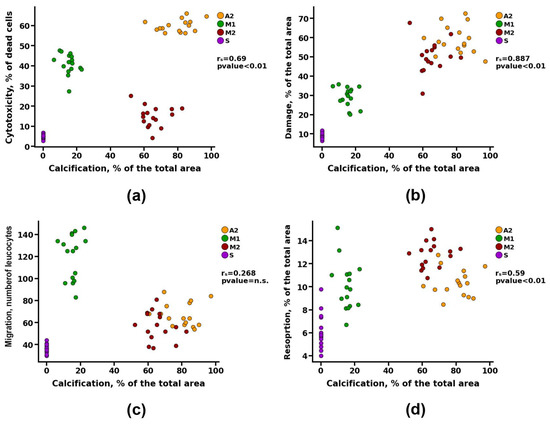 Spearman correlation analysis between the degree of calcification and (a) value of cytotoxicity, (b) matrix damage, (c) cell migration, and (d) resorption.