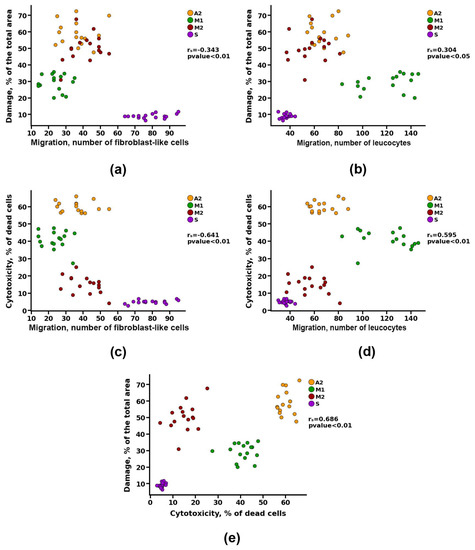 At the same time, no correlation was found between the migration of leukocytes into the matrix of the materials and its calcification (Figure 8c). However, there was a noticeable correlation between the indicators of cell migration and the degree of cytotoxicity (rs > 0.5) and a moderate correlation between the indicators of cell migration and damage to the matrix of materials (rs > 0.3) (Figure 9).
