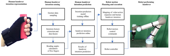 The human HIP module consists of an offline human HIP model training unit and an online human HIP unit. In the offline model training unit, an offline dataset, which is composed of gesture data and corresponding intention labels, is used to construct a group of fuzzy rules. The fuzzy rules are used to generate a human HIP model. This generated model is used by the online human handover intention prediction unit. In the online human HIP unit, the bending angles of five fingers from the human HIS module are used by the human HIP model as input data. According to the input data, the human HIP model calculates the prediction result of human handover intention. The prediction result of human handover intention is input into the robot motion planning and execution module. According to the prediction result of human handover intention, the robot motion planning and execution module generate corresponding action sequences and motion control instructions, which control the robot to perform a specific movement in a human–robot handover.