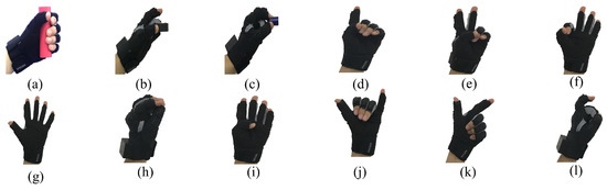 In this study, to verify the effectiveness and advantages of our proposed method, we selected 12 human gestures to represent human handover intentions as shown in Figure 2. The reason why we selected these 12 human gestures is that: We ask 5 individuals (two females and three males) to conduct handover tasks by delivering/picking up objects to/from a robot. By investigating and studying their handover manners, we find that the selected 12 kinds of handover intentions are commonly used for their handover intention expression in the human–robot handover process. This is why we selected these 12 gestures. These intentions include (a) Give the big red cylinder, (b) Give the middle black cylinder, (c) Give the small blue cylinder, (d) Need the big red cylinder, (e) Need the middle black cylinder, (f) Need the small blue cylinder, (g) Rotate arm, (h) Rotate hand, (i) Move up, (j) Move down, (k) Move close, and (l) Move far.