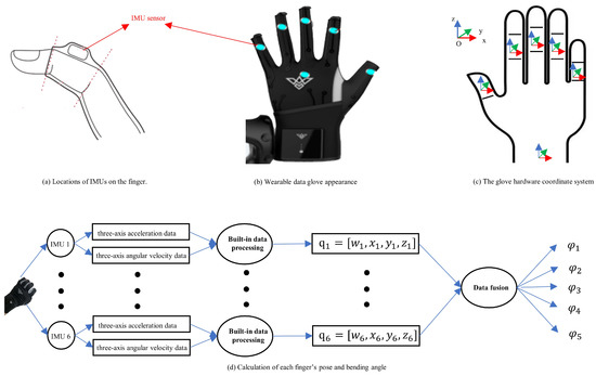 Human gestures can be expressed through the attitudes of five fingers and the back of the hand as shown in Figure 3d. These attitudes can be sensed by the six IMUs in the data glove. The sensing data obtained by each IMU include the original three-axis acceleration data as well as the original three-axis angular velocity data [45]. These original data can be transformed to quaternion by the built-in data processing algorithm in an IMU [46]. The quaternion obtained from each IMU can be expressed as