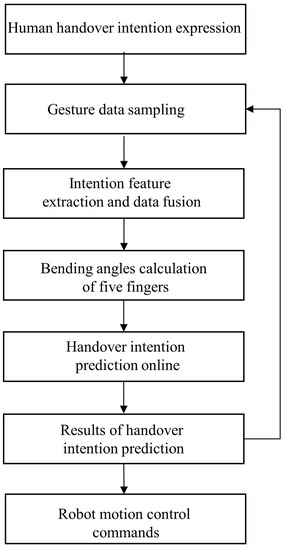 where H and L stand for high and low thresholds, respectively, and stands for a human handover intention. The fuzzy variables are . Therefore, if the bending angle of the thumb is within the bounds of , the bending angle of the index finger is within the bounds of , the bending angle of the middle finger is within the bounds of , the bending angle of the ring finger is within the bounds of , and the bending angle of the small finger is within the bounds of , we can conclude that the human desires to carry out the handover intention . These thresholds are determined according to information gathered from user studies. The experiment section includes a presentation of the results. The generalized flowchart of the proposed approach is shown in Figure 4.