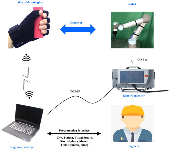 - For human HIS, a wearable data glove is used to sense human handover intention information. Compared with vision-based and physical contact-based sensing methods, data glove-based sensing is not affected by visual occlusion; thus, it does not pose threats to human safety.