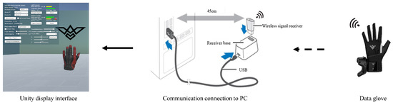 In this section, we experiment to evaluate the effectiveness of the proposed approach in terms of the sensing ability of human intentions. During the experiment, a human wearing a data glove performs several intentions with different gestures. The IMUs in the data glove sample pose information of the human’s fingers and send the sampled data to Unity on PC as shown in Figure 6. After Unity has received the sampled data, it restructures and displays human gestures in the virtual environment.