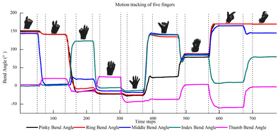Figure 7 shows the sensing results of humans’ intentions. It can be observed that when the human wearing a data glove performs different intentions of “One”, “Two”, “Three”, “Four”, “Five”, “Six”, “Seven”, “Eight”, and “Nine” by different gestures, the data of these gestures can be sampled by the data glove and sent to Unity. Unity successfully restructured and displayed these gestures in the virtual environment as shown in Figure 7. Furthermore, we record the bending angles of the five fingers when the human performs intentions by different gestures as shown in Figure 8. It can be observed that the motion of five fingers can be tracked successfully in real time. Therefore, human intentions can be successfully sensed by our method. The sensing data are used to predict human handover intentions.