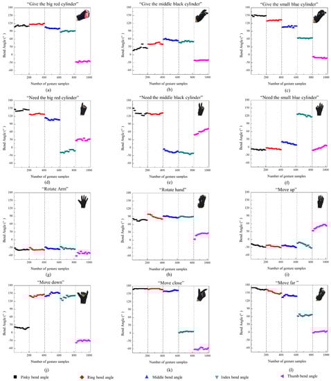 We asked the experimental participant wearing the wearable data glove to present 12 different handover intentions as depicted in Figure 2. Each handover intention is presented 200 times. For each presentation, the pose data of five fingers are sampled by the IMUs in the data glove. Using these sampled data, we can calculate the bending angles of five fingers using Equations (3)–(5). The bending angles of five fingers for all the 12 handover intentions in the 200 presentations are shown in Figure 9.