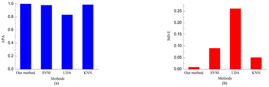 The results of average prediction accuracy (APA) of the 12 handover intentions are illustrated in Figure 10a, and the standard deviation of the prediction errors (StD-E) of the 12 handover intentions are illustrated in Figure 10b. The histogram shows that the APA results of these methods are 99.6%, 97.6%, 82.9%, and 98.4%, respectively. It can be concluded that the proposed approach can predict all human handover intentions in human–robot collaboration more accurately than other methods. Additionally, Figure 10 demonstrates that the StD-E produced by the proposed model is approximately 0.008, which is significantly less than the StD-Es of SVM (0.09), LDA (0.26), and KNN(0.05). Consequently, it can be stated that our method is more reliable in predicting human handover intentions.