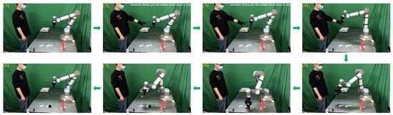 We employed human gestures to represent human handover intentions because they are more advantageous compared to other approaches [36]. For example, compared with using natural language to represent human handover intentions [37], using human gestures to represent human handover intentions avoids interference from noise in the industrial environment. Compared with using the human gaze to represent human handover intentions [38,39], using human gestures to represent human handover intentions will be more natural and intuitive.
