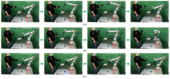 In this section, we conduct an online robot motion mode adjustment experiment. During the handover process, the experimental participant wears a data glove on the left hand and expresses the “Move up”, “Move down”, ”Move close”, “Move far away”, “Rotate the gripper” and ”Rotate the arm” intentions to the robot separately. The robot predicts the intentions of the experimental participant and adjusts its motion mode according to the prediction result. Figure 12 shows the process of the robot motion mode adjustment using our approach. As shown in Figure 12a((1),(2)), once the human expresses the “Move up” intention, the robot moves its gripper upward. When the human expresses the “Move down” intention, the robot moves its gripper down as shown in Figure 12a((3),(4)). After the human presents the “Move close” intention, the robot moved closer to the human as shown in Figure 12b((1),(2)). After the human presents the “Move far away” intention, the robot moved far away from the human as shown in Figure 12b((3),(4)). From Figure 12c((1),(2)), we can observe that after the human expresses the “Rotate your gripper” intention, the robot rotated its gripper. From Figure 12c((3),(4)), we can observe that after the human expresses the “Rotate your arm” intention, the robot rotated its arm. These pictures taken during the experiment show that through the proposed approach, the robot successfully predicts the human’s intentions and adjusts its motion mode correspondingly.