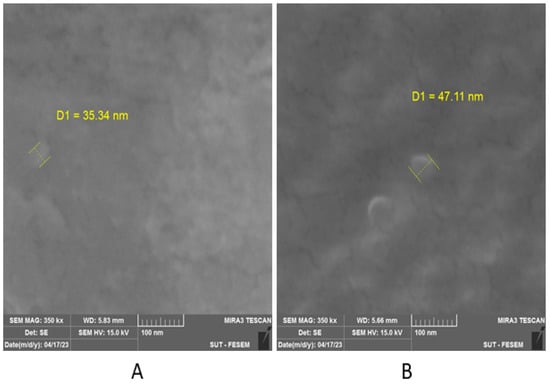 Particle size under field emission scanning electron microscopy. (A) The size of the nanoparticles of ChN, and (B) ChSimN.
