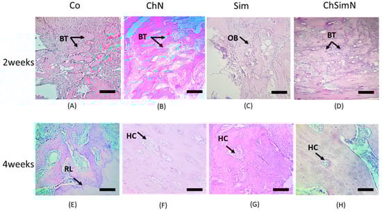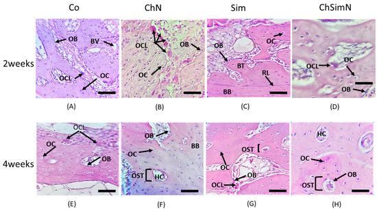Histological section of the bone defect. (A) Control group (Co) at two weeks. The black arrow indicates new bone trabeculae (BT). (B) Chitosan nanoparticle group(ChN) at two weeks, showing newBT. (C) Simvastatin group(Sim) at two weeks. The arrows indicate osteoblasts (OBs). (D) Combination of chitosan nanoparticles and simvastatin (ChSimN) at two weeks. The arrow shows new BT. (E) Co at four weeks, showing mature BT separated from the basal bone by a reversal line (RL), which is indicated by the arrow. (F) ChN at four weeks, showing mature bone. The arrow indicates a haversian canal (HC). (G) Sim group at four weeks, showing HC. (H) ChSimN at four weeks, showing HC. H&E × 10. Scale bar = 100 µm, n = 42.