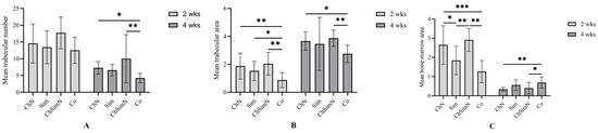 Upon analyses of the mean TN, the result suggested significant differences between the groups at 4 weeks and nonsignificant differences at 2 weeks. At week 4, the TN of both ChN and ChSimN was significantly higher than that of the Co group (Figure 7A). After 2 weeks, all experimental interventions exhibited a significantly higher mean TA than the Co group. At week 4, the results revealed that the TA of ChN and ChSimN was significantly higher than that of the Co group (Figure 7B). At week 2, the results showed that the BMA of both Sim and Co had a significantly lower mean value than that of ChN and ChSimN, while at week 4, Co showed a significantly higher mean for the BMA than ChN and ChSimN (Figure 7C).