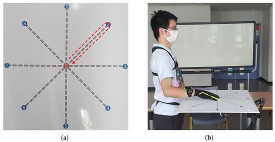 This study focuses on estimating the elbow joint motion and wrist pronation–supination during arm reaching movements, spanning across multiple directions in the horizontal planes. We designed our experiment by drawing inspiration from the investigation carried out in [26], which explored arm reaching movements towards target points arranged in a circular manner. We created a target grid consisting of eight points positioned along the circumference of a circle with a diameter of 0.5 m, as depicted in Figure 1a.