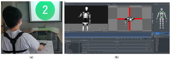 We employed neuron pro, an inertial measurement unit (IMU)-sensor-based full-body motion capture system, to capture the participants’ motion data. While this system’s accuracy may be lower than that of optical-camera-based motion capture systems, it offers the advantage of capturing motions without spatial constraints from any location within the device’s communicable range. The neuron pro system includes the axis neuron pro software (Figure 2b), which processes raw IMU data and generates a real-time 3D skeletal model. This skeletal model provides valuable motion information, including the position and angle of each joint, which can be saved for further analysis.
