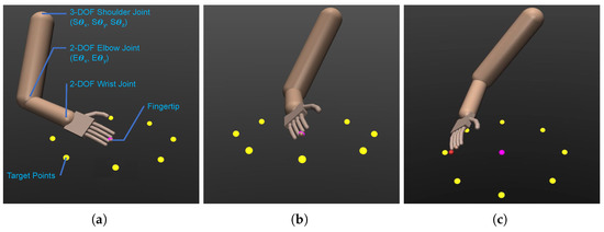 To generate synthetic motion data according to the predefined experimental protocols, we utilized MuJoCo [28], a widely used simulation engine in the DRL research community for studying multi-joint mechanical systems. We created an anthropomorphic 7-DOF robotic arm agent consisting of three sequentially connected modules: a 3-DOF shoulder joint with abduction, flexion, and rotation, a 2-DOF elbow joint with flexion and pronation, and a 2-DOF wrist joint with abduction and flexion, mimicking a human arm’s configuration. This arrangement, depicted in Figure 3a, replicates the total DOFs of a real human arm, considering the forearm’s axial rotation as part of the elbow joint articulation along with elbow bending. The arm’s endpoint is positioned at the fingertip of the middle finger.