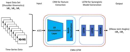 This study employed convolutional long short-term memory (CNN-LSTM) neural networks to train a neural network model capable of recognizing shoulder–elbow coordination and predicting elbow joint angles based on shoulder kinematics input. The CNN-LSTM architecture combines the strengths of both convolutional neural networks (CNNs) and long short-term memory (LSTM) recurrent neural networks (RNNs), which have shown promising results in various time series prediction or classification tasks. Recent studies, such as human activity recognition in [30], have explored combining CNN and LSTM layers to enhance performance. This combination is motivated by the idea that LSTM’s performance can be limited by the quality of the input features it receives [31]. By incorporating CNN layers, which are adept at reducing input frequency variance and extracting meaningful features, we improve the overall feature representation. The LSTM layers then capture temporal dependencies within the extracted features. Additionally, our approach integrates CNN and LSTM layers within a unified architecture, allowing optimized training for all layers.