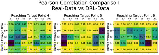 Figure 6 comprises individual confusion matrices demonstrating Pearson’s correlation comparison for reaching movements towards target points, specifically the target points numbered 4, 5, and 6. The columns labeled S1 to S6 depict the comparison with motion data from each subject sequentially, while the final column presents the comparison with the generated DRL-Data. Variations in Pearson’s correlation values can be observed due to the subjects’ inherent individual differences in reaching motion. However, the overall trend highlights the consistency among all participants and the DRL-Data, indicating a shared movement pattern. The similarity between the Pearson’s coefficient values of the DRL-Data and those of any other human subject’s motion data suggests that the synthetic dataset generated by our DRL-based motion cloning framework can be considered as an additional subject within the experiment.