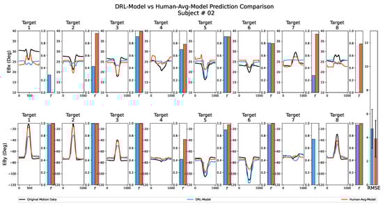 Figure 7 displays the results of the prediction performance analysis for both the DRL-Model and the Human-Avg-Model for one of the subjects. The line graph illustrates the variation in the joint angles (elbow pronation–supination and flexion–extension angle ) during reaching movements towards each target point, while the adjacent bars indicate the corresponding Pearson’s correlation coefficient values compared to the subject’s original joint angular variation. Additionally, as depicted in the bar graph in the last column, we computed the overall RMSE value by comparing the estimated and original joint angular values for all target points along with the error bar representing the standard deviation of the estimation error values. As suggested by similar Pearson’s correlation coefficient values and slight differences in overall RMSE values in Figure 7, both the DRL-Model and the Human-Avg-Model exhibited comparable performance.
