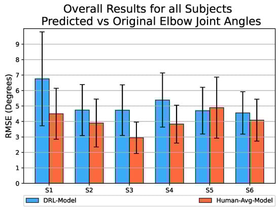 The bar graph in Figure 8 presents the overall RMSE values obtained for the prediction of elbow joint motion across all six participating subjects. Since the Human-Avg-Model was trained using an averaged human motion dataset as input, it is expected to have good prediction results. Although the DRL-Model with an overall average RMSE value of exhibits slightly lower performance compared to the Human-Avg-Model with an overall average RMSE value of , the results demonstrate its successful prediction of elbow joint angles with sufficient accuracy for all subjects.