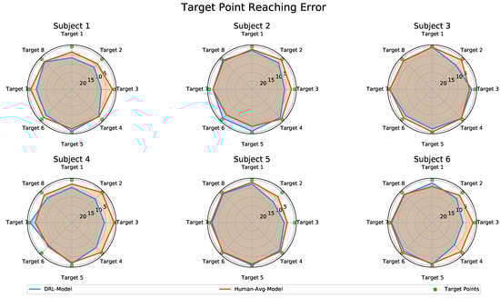 Figure 9 presents a comparison of the target reaching error based on the predictions made by the DRL-Model and the Human-Avg-Model, illustrated on polar charts. The predicted motion data from both the DRL-Model and the Human-Avg-Model demonstrated the successful reaching of most target points with reasonable accuracy across all subjects. Although there were slight variations in a few cases, the overall trend of final position errors was similar for both models, with an average overall mean value of for the DRL-Model and for the Human-Avg-Model, respectively.