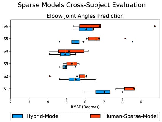 Box plot of the RMSE values comparing the predicted and actual elbow joint angles obtained from the cross-subject evaluation of the Hybrid-Model in blue and Human-Sparse-Model in red. The box size represents the range encompassing 75% of the values, with the solid vertical golden line inside indicating the median. A black diamond marker denotes the mean value. Circular markers represent outliers, and the whiskers indicate the maximum and minimum values. Smaller box sizes, along with lower mean and median RMSE values, indicate better performance.