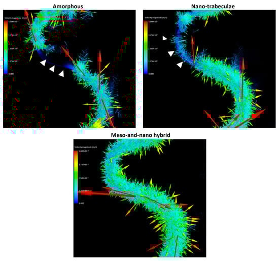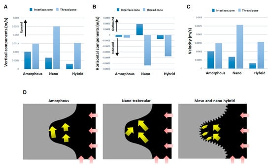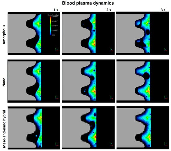 - Blood movement was slowest at the meso–nano hybrid interfaces and fastest at the amorphous interfaces. The blood velocity at the interface was 3- and 4-fold lower for the hybrid topography compared with the nano-topography and amorphous surfaces, respectively.