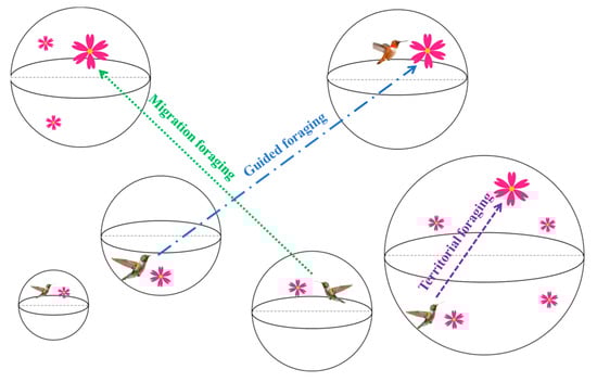 The Artificial Hummingbird Algorithm (AHA) [64] is a novel bionic MA proposed in 2021, inspired by the unique flight skills, intelligent foraging strategies, and strong memory capacity of hummingbirds. Hummingbirds are the smallest but most intelligent birds in the world. They have three special flight skills and three intelligently adjusted foraging strategies. Three foraging behaviors of hummingbirds are shown in Figure 1. Meanwhile, most notably, they have a strong memory, so AHA constructed the visit table to simulate the unique memory ability of hummingbirds for food sources.
