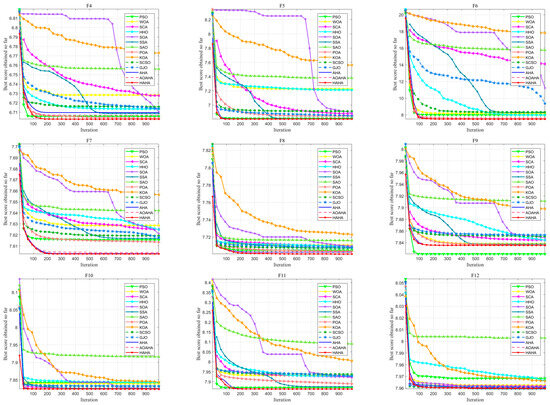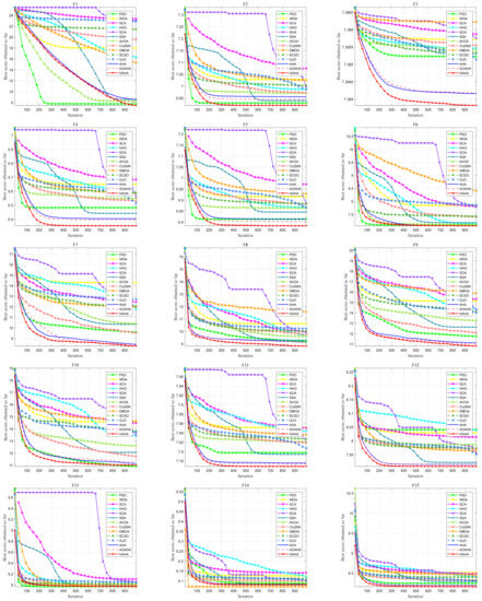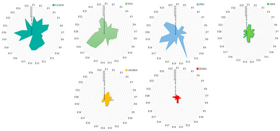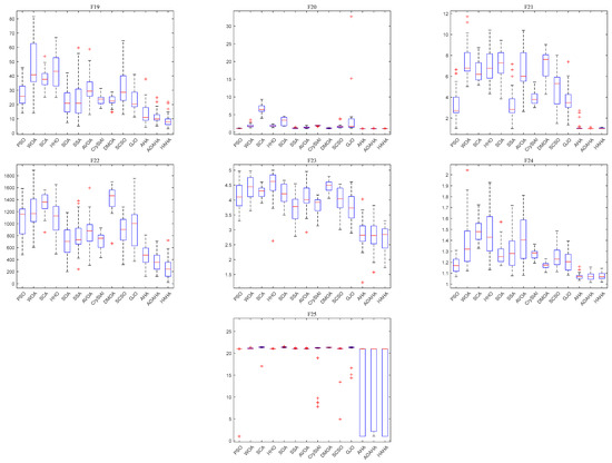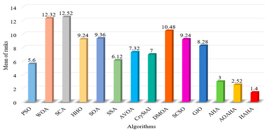 Computational complexity is one of the significant indicators used to evaluate the efficiency of an algorithm, including space complexity and time complexity. The computational complexity of the proposed HAHA is related to algorithm initialization (Init), the individual fitness value (FV) in each iteration, D, n, and T. In this paper, “Oh” represents the computation complexity of the algorithm. Initialization is to assign values to each dimension of the hummingbirds, so the computation complexity is expressed as Oh(nD). HAHA needs to calculate the individual fitness value in each iteration, so the computational complexity can be defined as Oh(T‧FV‧n). HAHA introduces EOL in guided foraging (gui fora), which increases the computational complexity of AHA. The computational complexity of this stage is Oh(TnD/2 + TnD/2). The PSO strategy is introduced in territorial foraging (ter fora), and the computational complexity of this stage is defined as Oh(TnD/2 + TnD/2). The Cauchy mutation strategy is introduced in migration foraging (mig fora), so the computational complexity is Oh((TnD + TnD)/(2n)). Therefore, the overall computational complexity of the proposed HAHA can be expressed by Equation (17):