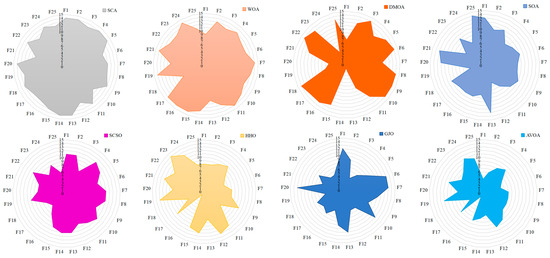 SI is the most popular branch of MA used to simulate the collective behavior of social animals in nature. Particle Swarm Optimization (PSO) [47] is the most classic SI, inspired by the social behavior of birds and often used to solve various global optimization problems. Famous SI algorithms also include, but are not limited to, Ant Colony Optimization (ACO) [48], based on the collective behavior of ant colony, Moth–Flame Optimization (MFO) [49,50,51], the Grey Wolf Optimizer (GWO) [52] simulating the cooperative hunting behavior of gray wolves, the Whale Optimization Algorithm (WOA) [53], Harris Hawk Optimization (HHO) [54], the Black Widow Algorithm [55,56], the Seagull Optimization algorithm (SOA) [57], the Salp Swarm Algorithm (SSA) [58,59], the African Vultures Optimization Algorithm (AVOA) [60], the Dwarf Mongoose Optimization Algorithm (DMOA) [61], the Pelican Optimization Algorithm (POA) [62], Golden Jackal Optimization (GJO) [63], the Artificial Hummingbird Algorithm (AHA) [64], etc. Among them, AHA is a recently proposed bionic MA that is inspired by the intelligent foraging behaviors, special flight skills, and amazing memory function of hummingbirds. Hummingbirds have three unique flight skills: axial, diagonal, and omnidirectional flight. These skills are flexibly and alternately used in its three foraging behaviors. The migration foraging strategy provides the algorithm with powerful exploration capabilities, territorial foraging improves population diversity and avoids the possibility of the algorithm falling into local optima, and guided foraging creates an intelligent balance between exploration and exploitation. In addition, the visit table was established to simulate the powerful memory abilities of hummingbirds.
