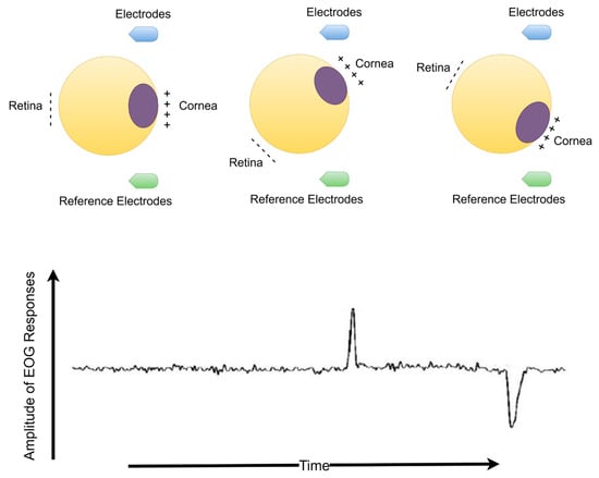 Electrooculography (EOG) is electrical activity resulting from a potential change due to eyeball or eyelid movements. The EOG waveform is recorded with skin electrodes around the eyes, or EEG electrodes are placed on the scalp. The amplitude of the EOG signals occurs between 10 and 200 µV and has been observed to change at frequencies falling within the 0.5–15 Hz range. The eyeball acts as a dipole and charged organ [12,13,14]. The positive and negative poles are oriented anteriorly (cornea) and posteriorly (retina). When the eyeball rotates about its axis, thus acting can generate a detectable amplitude electric signal that is distinguished by any electrodes near the eye or scalp electrodes. When the eyeball rotates upwards, the positive pole (cornea) closes to the frontal electrodes, producing positive deflection changes. Otherwise, when the eyeball rotates downwards (closer to the ear reference electrodes), it produces a negative deflection change. Deflections of eye blink resemble this situation. When the eyelid closes, the cornea closes to frontal electrodes, and a positive pulse occurs. However, the eyelid opens, and the cornea rotates away from the frontal electrodes, producing a negative pulse. The duration of eye blinking occurs in the range of 300 to 400 ms [14].